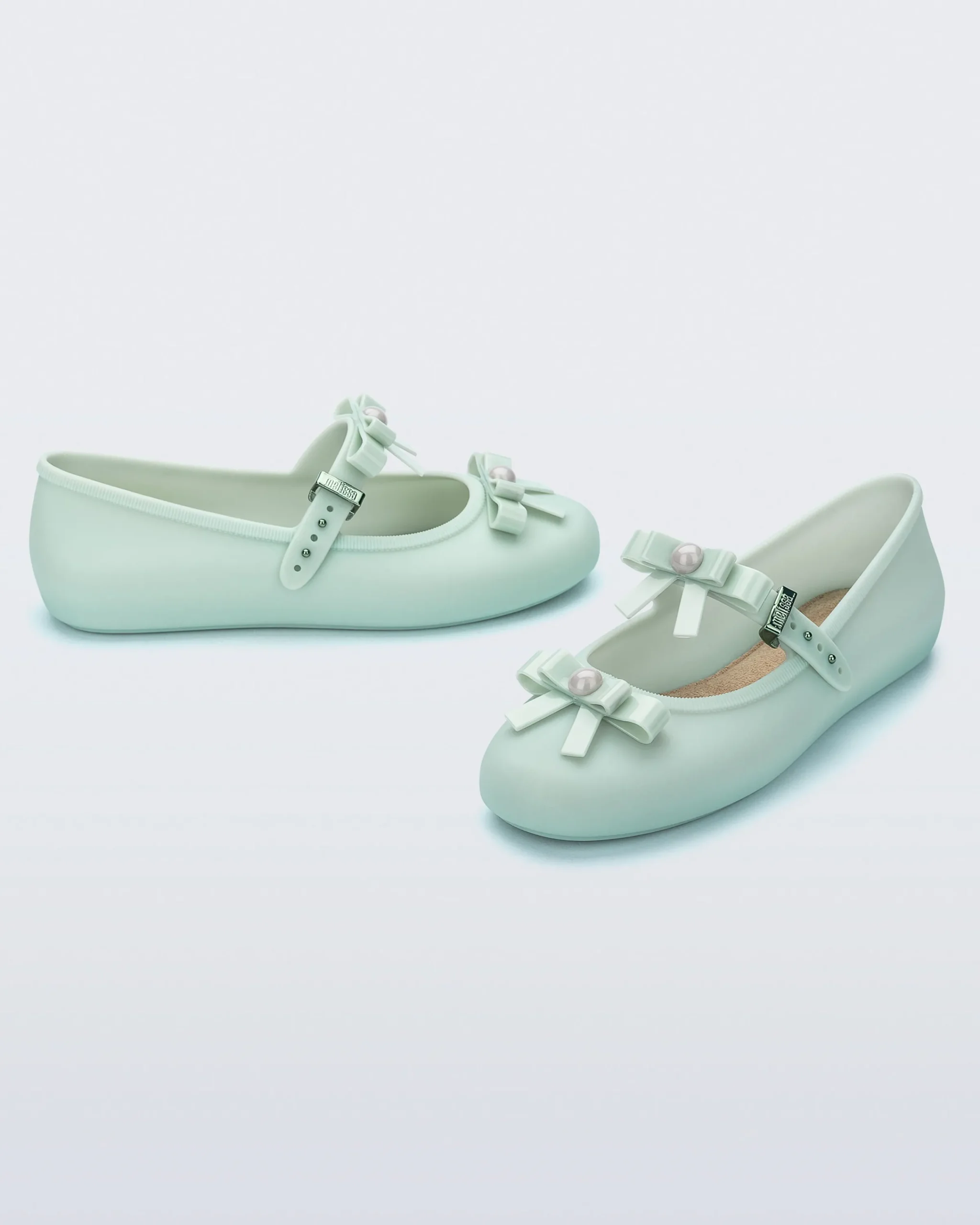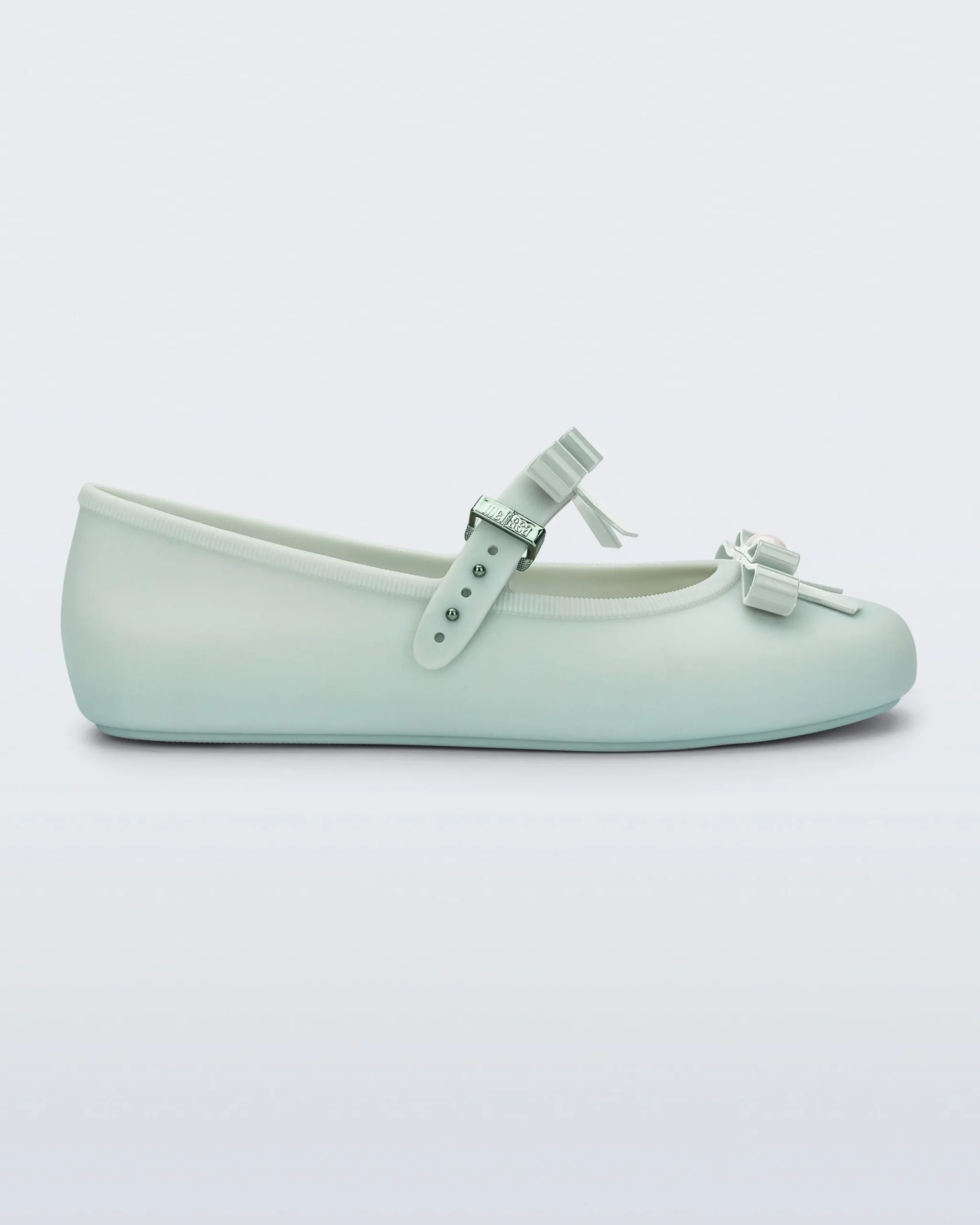 The Melissa Soft Ballerina Bow is a classically feminine ballet flat that features bows on the strap and toe. Adorned with pearl-like detail, this comfy, secure style is an easy way to dress up an otherwise simple look that’s undoubtedly comfy and timeless. This easy to clean, season-less shoe can be worn with or without socks.